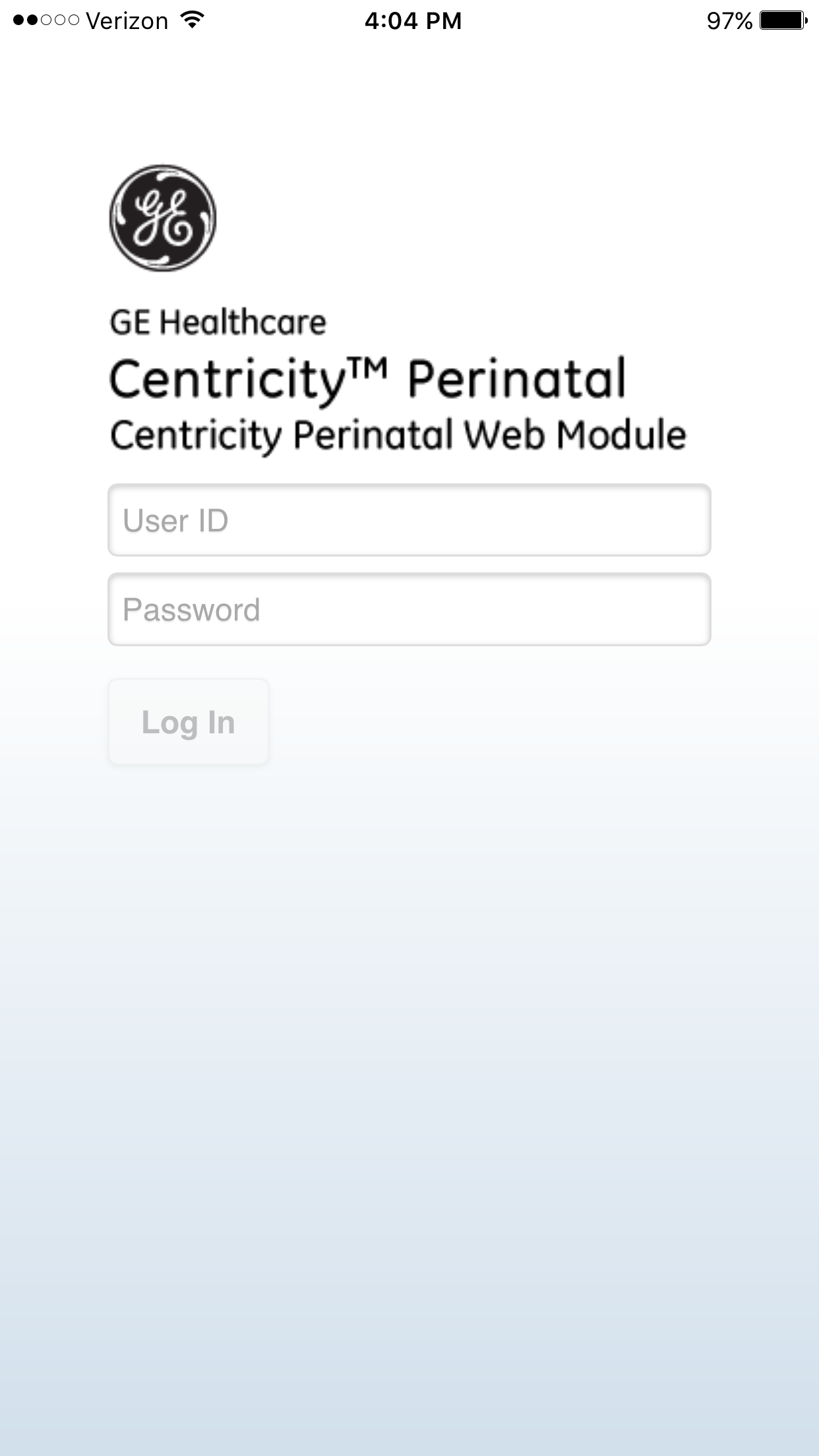 - Tap Log in. Note: If the system is unable to authenticate your User ID or password, a message is displayed stating as such. Try again, then contact the System Manager if it continues.Note: If you do not have a license to use Centricity Perinatal Web, a message is displayed stating as such. Contact the System Manager to obtain access.